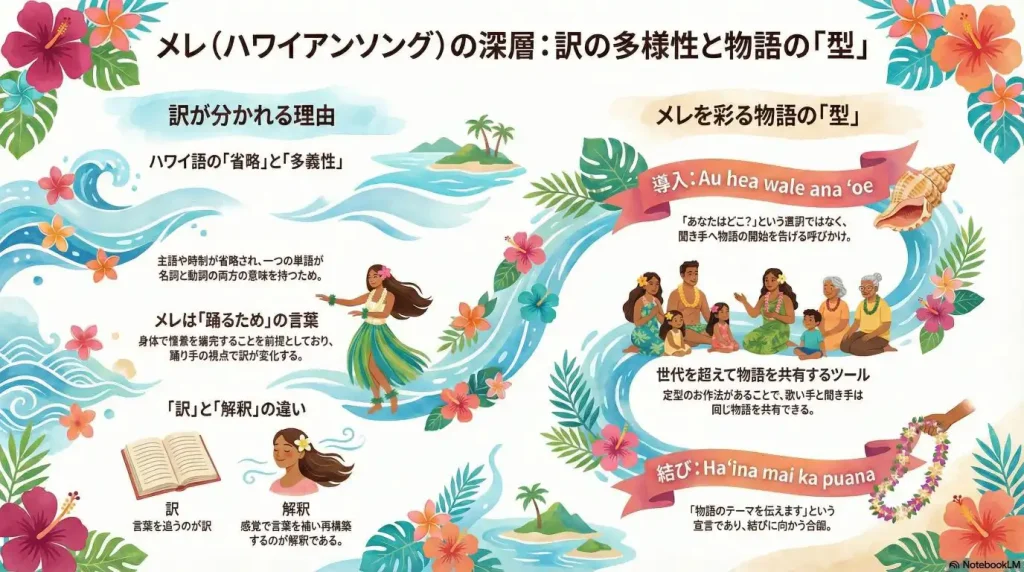 ハワイアンソングを深く紐解くと、資料によって日本語訳が異なっていたり、どの曲にも共通のフレーズが登場したりすることに気づきます 。なぜハワイの歌には独特の「揺らぎ」や「約束事」があるのか。そこには、語り継ぐための確かな知恵が隠されています 。